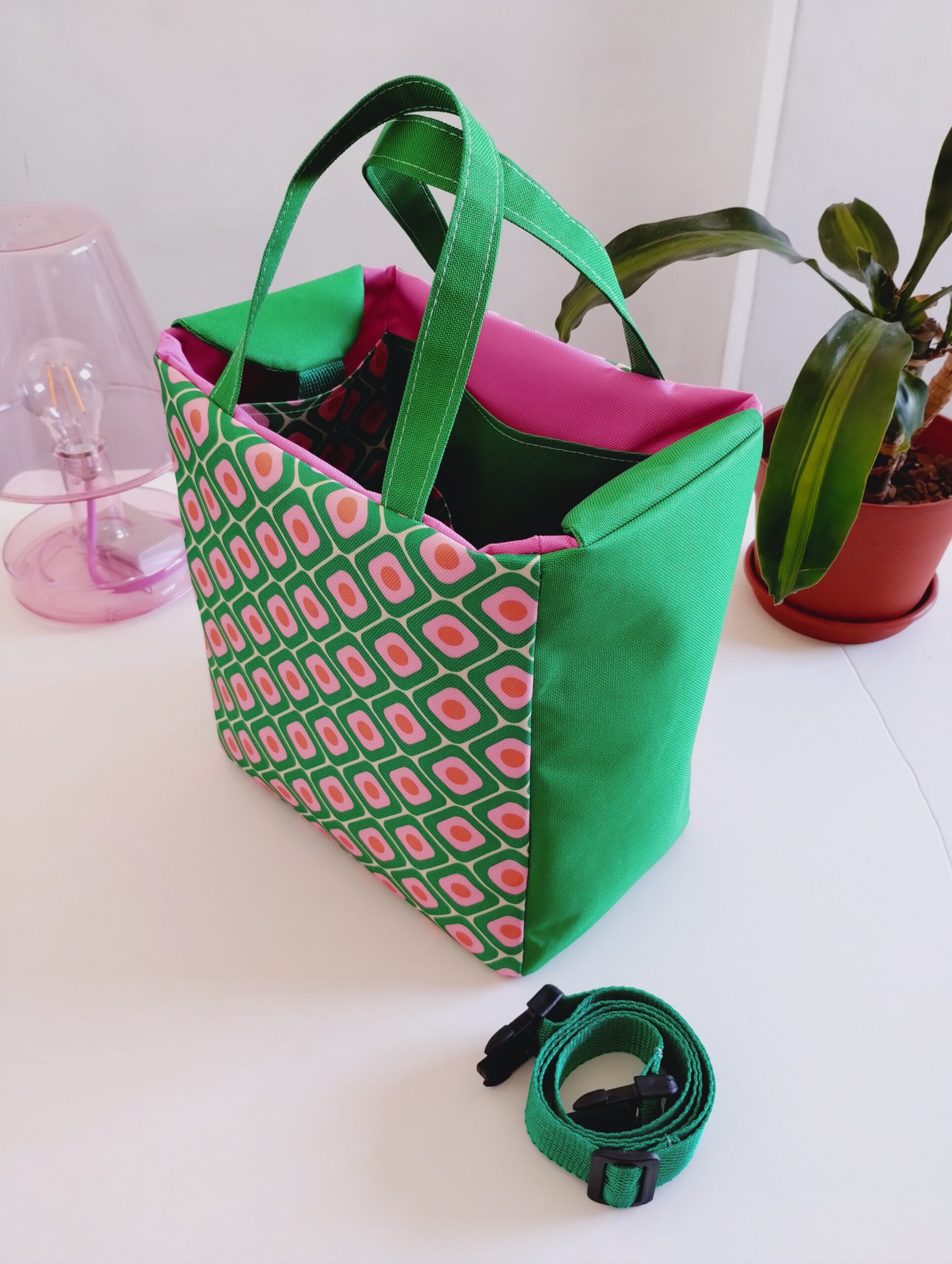 Canasta multiuso que combina una tela estampada con una a tres telas lisas. Es reversible y cuenta con manijas cortas y una cinta regulable y desmontable, para usarla al hombro o cruzada al cuerpo.