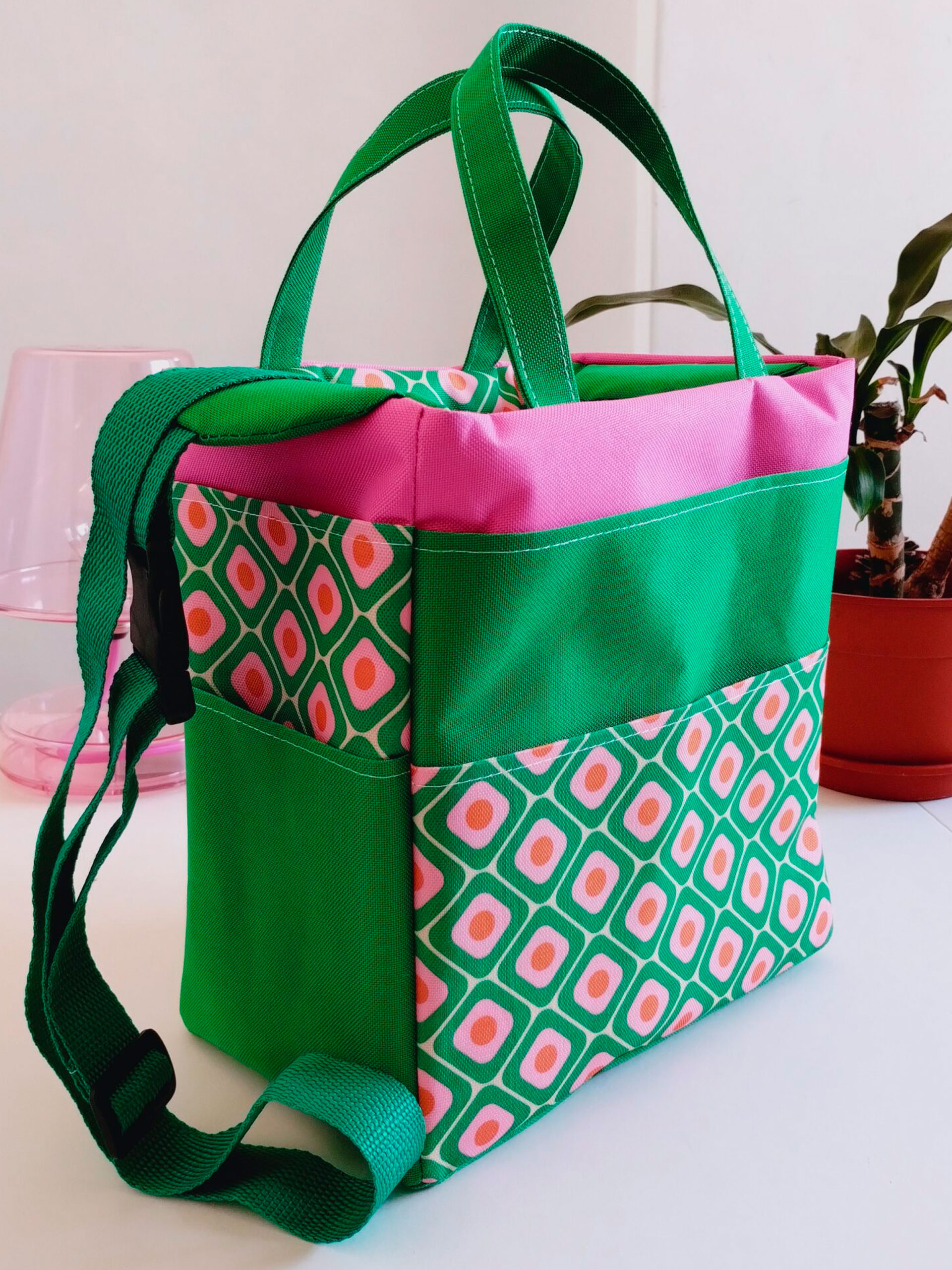 Canasta multiuso reversible, con tela estampada y lisas, manijas cortas y cinta regulable desmontable. Práctica, resistente y con 8 bolsillos de distintos tamaños.