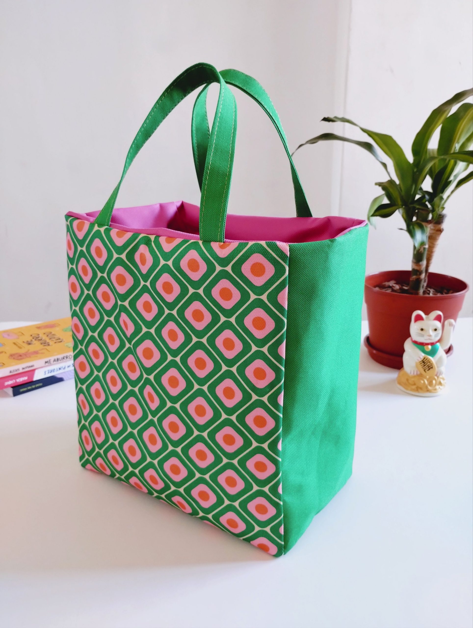 Confeccionada en telas resistentes al agua, de fácil mantenimiento y apta para lavarropas, no se deforma gracias a las placas aislantes ubicadas entre las telas en cada cara y en la base.
